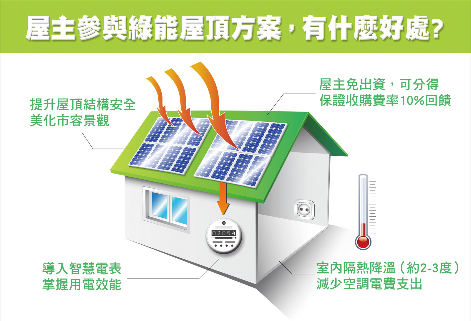 屋頂承租專案 隨著全球暖化日益嚴重與傳統能源快速耗竭,世界各主要國家莫不將節能減碳列為施政重點方向,進行能源戰略佈局,以綠色能源作為驅動經濟發展的新引擎。 經濟部於106年10月再宣布推動「綠能屋頂全民參與」推動方案,打造綠能屋頂美化市容景觀,建立分散式自發自用乾淨能源,改善空氣空污與降低PM2.5,全民一起來協助達成2025年非核家園目標。 與我們聯絡 屋頂承租專案